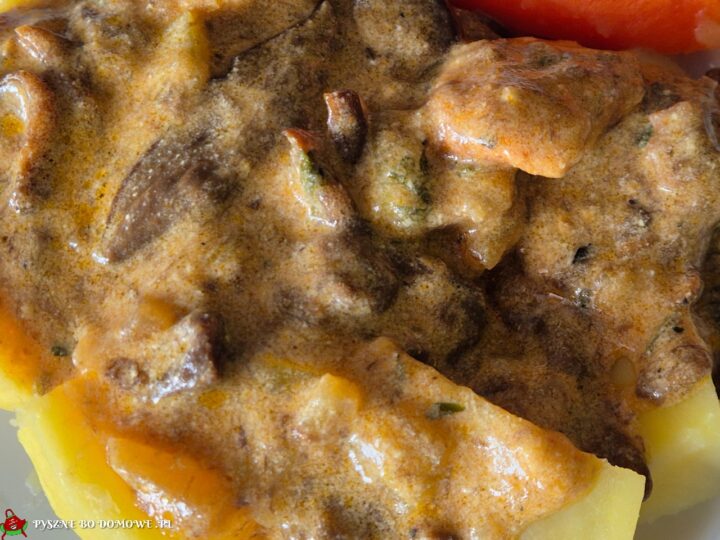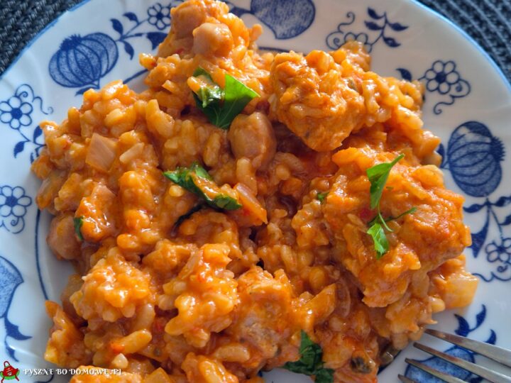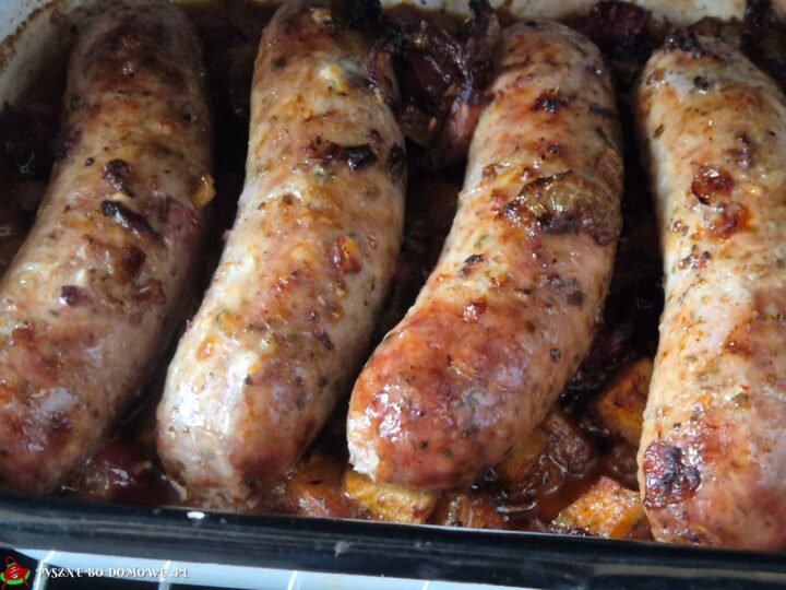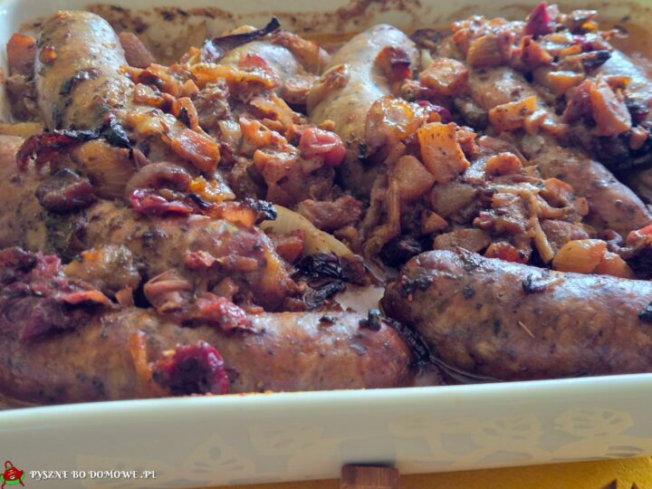 Kiełbasa biała pieczona z jabłkami i żurawiną Dania mięsne Kiełbasa biała pieczona z jabłkami i żurawiną