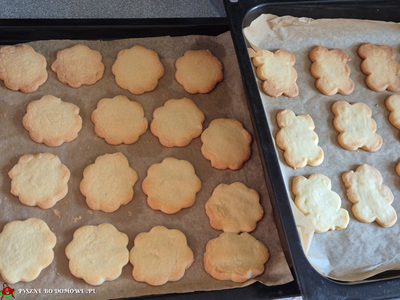Do pokrojonego masła dodać cukier puder i ukręcić na masę. Dodać mąkę, chwilę zamieszać robotem, a potem ciasto przełożyć na stolnicę, zagnieść kulę i podzielić ją na 2 części. Jedną z części rozwałkować na grubość 5 mm i wykrawać ciasteczka dowolną foremką. Kłaść na blachę piekarnika wyłożoną papierem do pieczenia. Podobnie czynność powtórzyć z 2 częścią ciasta. Wyjdą dwie blachy wykrawanych ciastek. wstawić do nagrzanego piekarnika obydwie blachy od razu termo obieg i nastawić go na `170 stopni C na 15 minut. Smacznego!