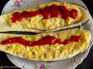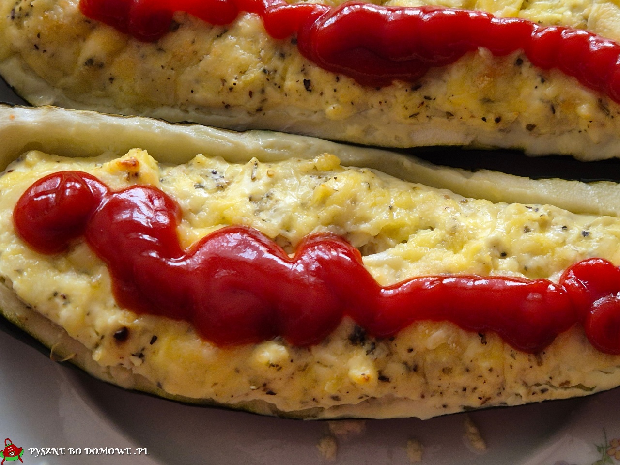 Cukinie umyć, odciąć ich końcówki i je wzdłuż przekroić na 2 części. Za pomocą łyżki wydrążyć środki ( nie wyrzucać, przydadzą się do gotowania zupy). Każdą łódeczkę cukiniową posolić.