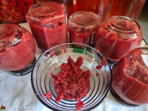 Owoce zlałam małą ilością wody i gotowałam do miękkości. Przetarłam je przez sito, pozbyłam się pestek. Sam mus znowu przełożyłam do garnka i wkroiłam małe kawałki jabłek. Chwilę podgotowałam , dodałam żelfix, dobrze wymieszałam całość, dodałam cukier , wymieszałam i po 5 minutach uzyskałam gorący dżem, który przełożyłam do małych słoików. Postawiłam go do góry nogami i ostudzony przełożyłam do piwnicy. Dżem będzie do deserów, naleśników czy na kanapki. Polecam!