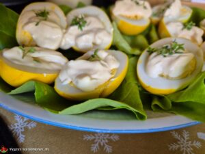 Pięknie wyglądają takie jaja na liściach sałaty. Żółciutkie przyozdobione majonezem i rzeżuszką. Polecam! Składniki: 1 litr wody 300 ml octu jabłkowego 3 łyżki kurkumy 8 jaj gotowanych na twardo majonez rzeżuszka liście sałaty Wykonanie: Wymieszać wodę z octem i kurkumą. Gotować 10 min i wystudzić. Przelać przez gazę do większego słoja. Dodać obrane i ugotowane … Czytaj dalej Jaja w kurkumie