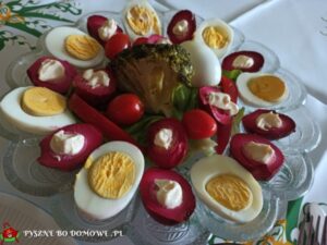 Chcesz mieć jaja zabarwione na piękny buraczany kolor? Nic prostszego do zrobienia. Jaja pięknie się prezentują na półmisku. Mogą być przystrojone kleksem majonezu lub pastą majonezowo- łososiową. Taki półmisek jaj przyda się na różne okazje. Polecam! Składniki: 4-5 jaj ugotowanych na twardo koncentrat barszczu czerwonego lub zakwas buraczany majonez do dekoracji Wykonanie: Jaja obrać ze … Czytaj dalej Jaja w zakwasie buraczanym