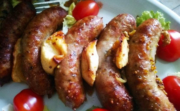 Kiełbasa biała pieczona w cebuli z jabłkiem