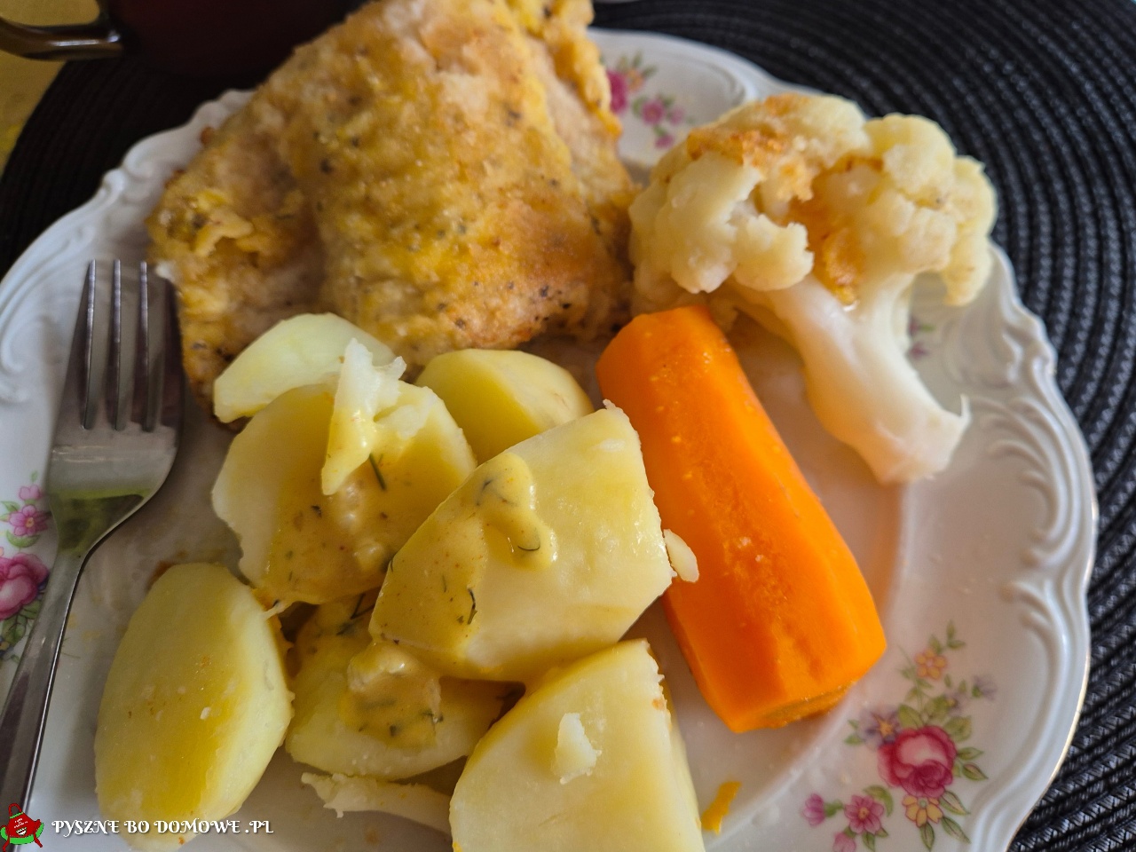Warzywa obrać i ugotować w osolonej wodzie do miękkości. Filety rybne oczyścić, umyć i osuszyć papierowym ręcznikiem. Posolić i posypać świeżo zmielonym pieprzem. Włożyć do rozmąconego jaja i obtoczyć je w mące. Smażyć na złoto na gorącym oleju. Warzywa odcedzić z wody, przełożyć na talerze i dodać po kawałku usmażonej na złoto ryby. całość można posypać drobno pokrojonym koperkiem lub natką pietruszki. Smacznego!