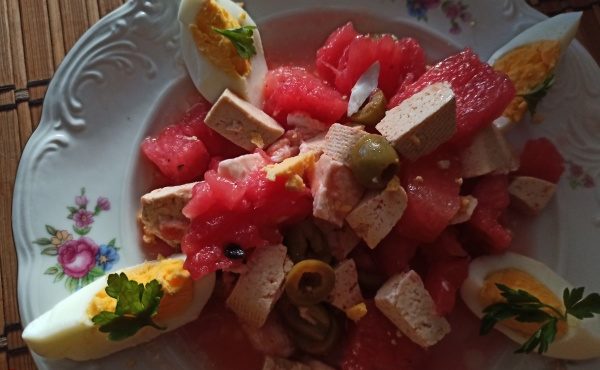Sałatka arbuzowa z oliwkami, tofu naturalnym i mozzarellą
