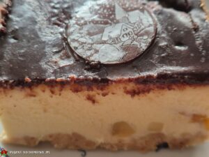 Herbatniki rozkruszyć i połączyć z roztopionym masłem. Kłaść równą powierzchnią na blachę ( 25×30 cm) i odłożyć na bok.