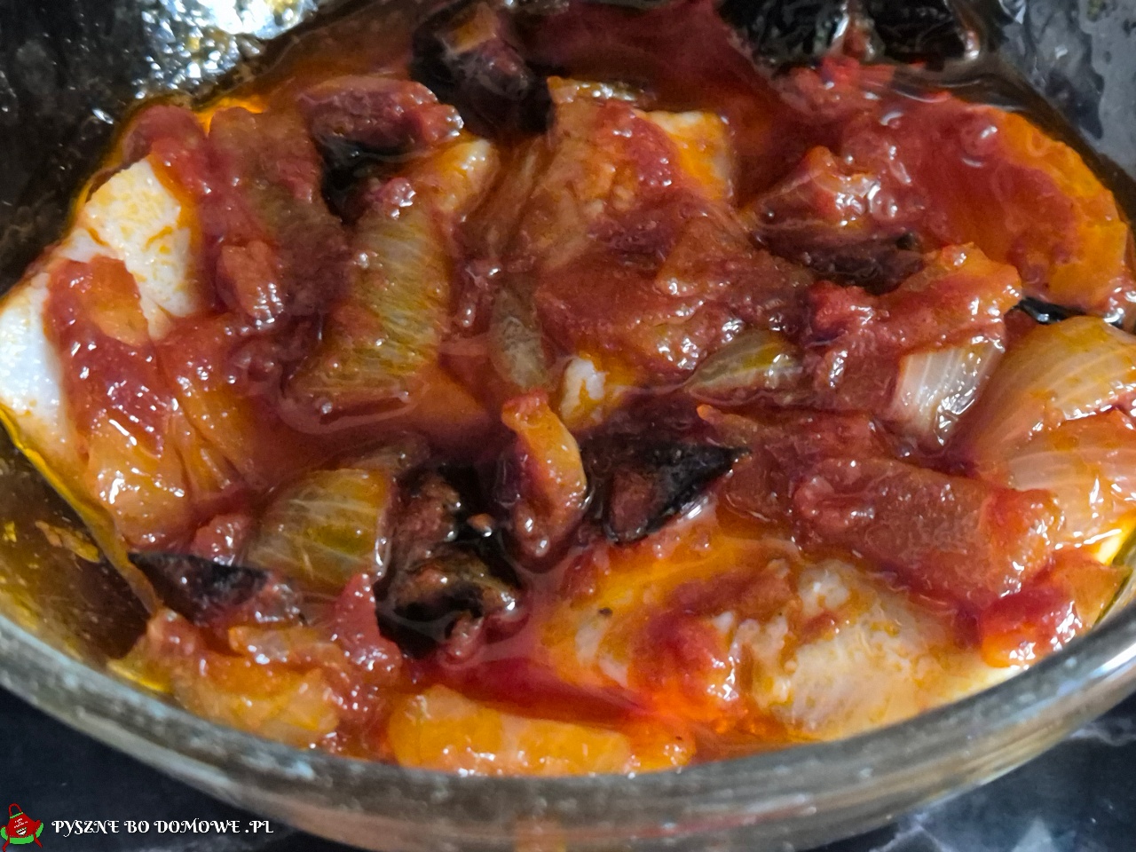 Śledzie moczyć w wodzie 3 doby zmieniając im za każdym razem tą zimną wodę. Cebulę pokroić w piórka i zeszklić ją na oleju. Dodać sól, cukier ,pieprz, koncentrat pomidorowy i suszone drobno pokrojone śliwki. Całość zalać wodą i dusić ok 5 minut. Wyłączyć i posypać cynamonem i dosłodzić miodem i dodać śledzie pokrojone w romby. Wymieszać i najlepiej żeby potrawka postała trochę w lodówce. Podawać na półmisku posypaną potrawkę drobno pokrojonymi orzechami i natką pietruszki( ja to pominęłam, bo zabrakło mi natki i orzechów). Ale i tak śledziki tak podane były pyszne. Polecam!
