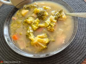 Porcję rosołową włożyć do osolonej wody i zagotować. Dodać do niej drobno pokrojoną włoszczyznę, kalarepkę i uwaga! – trzon z brokuła obrany i drobno pokrojony. Różyczki brokuła rozdzielam na drobniejsze i dam do zupy pod koniec gotowania. Metodą prób i błędów przekonałam się, że trzon od brokuła smakuje jak kalarepka! dlatego już nigdy go nie wyrzucam, tylko ma zastosowanie w zupach, sałatkach i surówkach. Z gotującej się zupy wyciągam porcję rosołową, oddzielam ją od kości i mięso wrzucam s powrotem do zupy. dodaję garść makaronu ryżowego i różyczki brokuła. Chwilę gotuję i do gorącej zupy dodaję rozmieszaną śmietanę z mąką zahartowaną kilkoma łyżkami tejże zupy. Na końcu daję przyprawy do smaku i gęsta, zawiesista zupa gotowa. Smacznego!